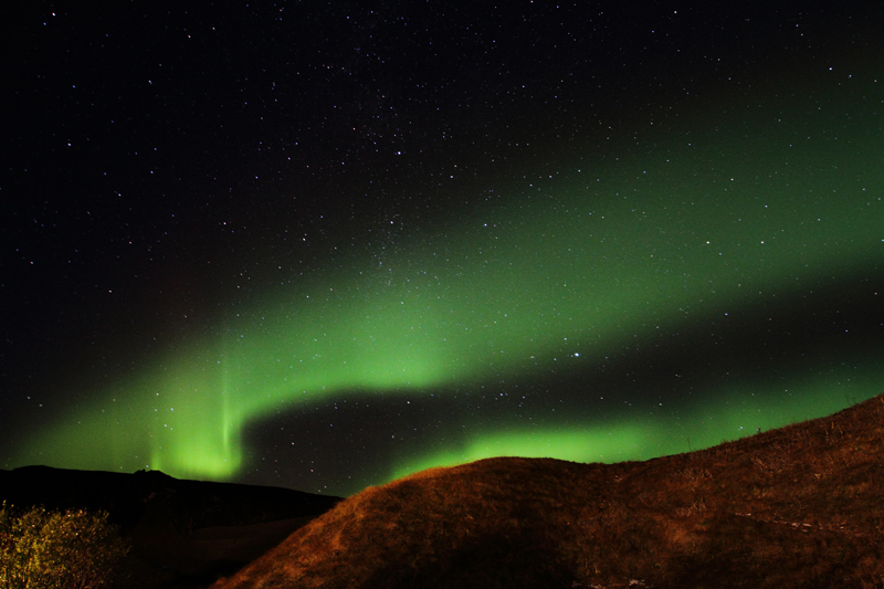 Una guida del posto ci porta per un sentiero dietro una montagna, completamente al buio, il cielo è incredibile, per la prima volta vedo le stelle fino all’orizzonte che congiunge cielo e terra, riconosco alcune costellazioni e da appassionato di astronomia mi rendo conto che siamo rivolti verso est e dietro abbiamo una montagna che ci impedisce la visione per l’altra metà del cielo. La cosa non mi affascina molto, non vedo la stella polare, il nord è leggermente dietro di noi, e quando dopo un’ora circa quasi tutti si ritirano e tornano in camera, io mi riporto verso l’inizio del sentiero per scoprire l’altra parte di cielo. Rimango solo o almeno credo, voglio rimanere, voglio provare, potrebbe essere l’unica occasione. Un fotografo si avvicina e mi chiede se rimango fuori, anche lui vuole provare a restare forse a prendere soltanto freddo. Saliamo su una collina e dopo circa un’ora di conversazione sul mondo fotografico (lui ha una Canon 5D mark III che guardo con invidia) Ludovico, questo il nome del mio compagno di caccia all’aurora, nota un bagliore verso nord ovest, forse ci siamo, è da poco passata l’una di notte. Facciamo qualche scatto, e qualche cosa di verde appare sui monitor delle nostre Canon. Il chiarore svanisce. Ci sembra già molto visto che le previsioni davano zero.